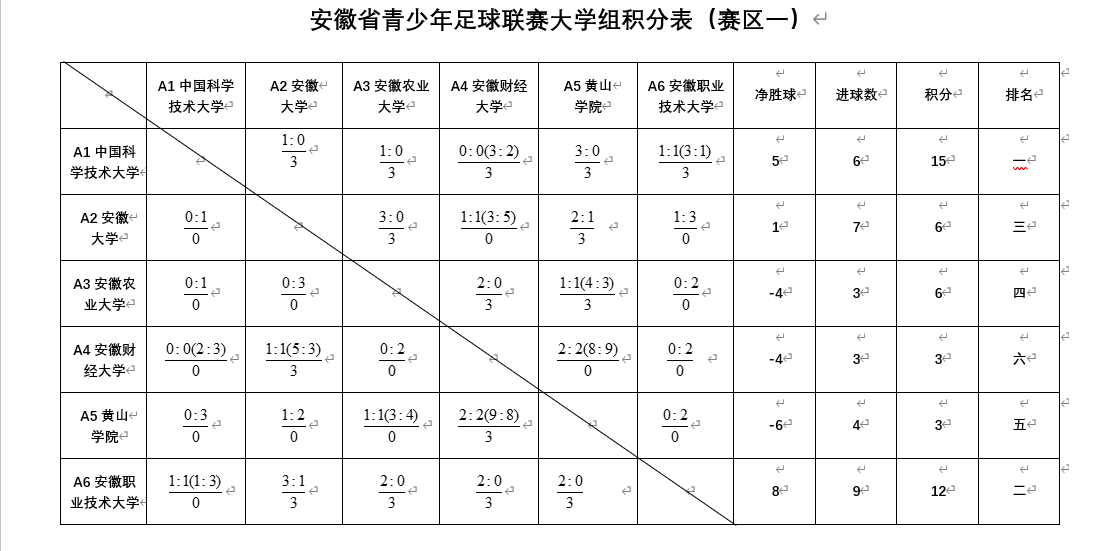 中国科学技术大学发挥出色,五战全胜,以绝对实力锁定头名;安徽职业技术大学表现稳健,四胜一负位列第二。积分相同情况下,安徽大学与黄山学院凭借相互胜负关系,分别领先安徽农业大学与安徽财经大学,竞争过程紧张有序、结果公正明晰。