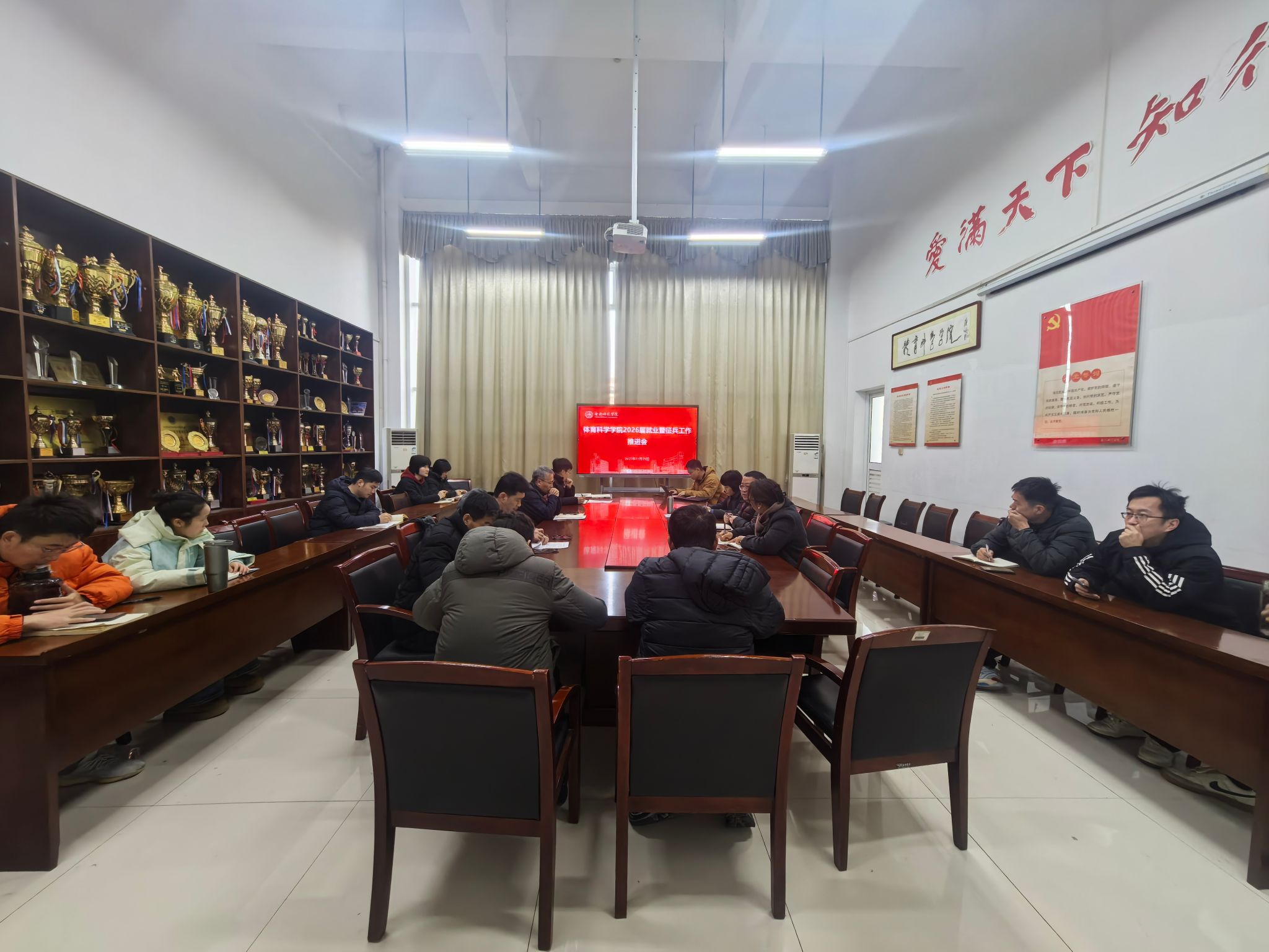 12月29日上午,体育科学学院在锦绣校区体育馆会议室召开2026届毕业生就业暨征兵工作推进会,全面总结学院2025届毕业生就业工作,系统部署2026届毕业生就业与大学生征兵工作。学院党政领导班子成员、党委委员、各系部主任及副主任、全体辅导员共同参会。