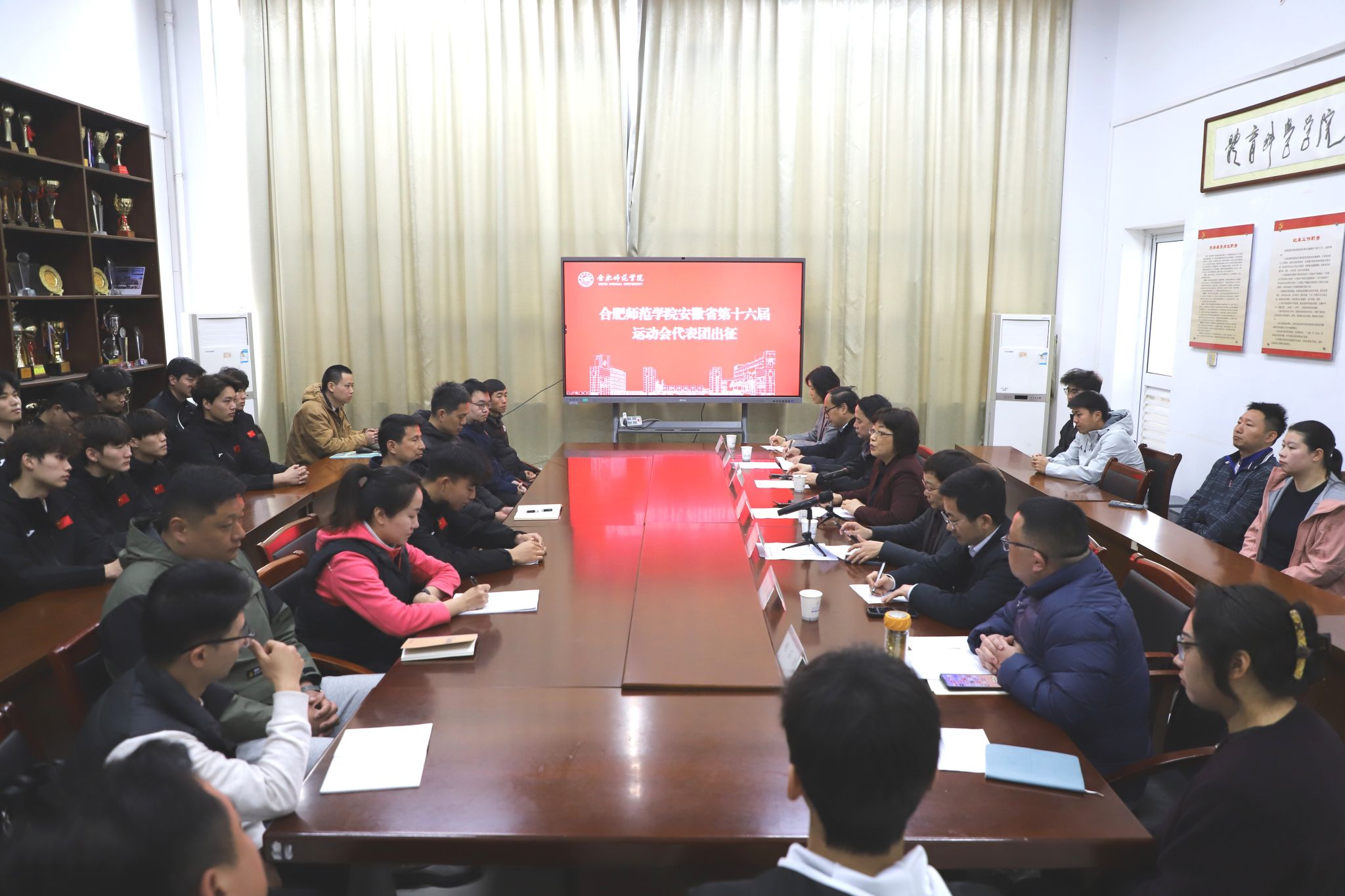 3月27日上午,学校参加安徽省第十六届运动会出征仪式在锦绣校区体育馆会议室举行。校党委书记、校长方东玲出席仪式并作动员讲话,校党委副书记梁立昌主持仪式。校党委委员、宣传部、统战部部长常树宝,党政办主任朱玉国,学生工作处处长赵波,体育科学学院党政负责人等参加仪式。排球队全体教练员、运动员及参加省运会的教练员、运动员代表共同参加。